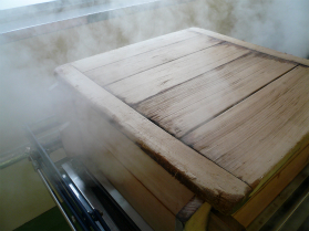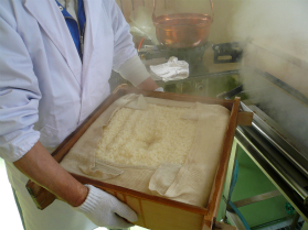 長時間かけ蒸されたもち米は、蒸し暑い部屋の中でも甘い香りが広がります。