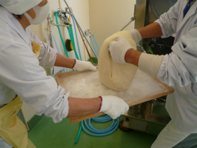 熟練の目でおもちを観察して、手でひっくり返します。もち米は、ついて潰して粘りと甘み、そしてなめらかさを出すためには機械のできない動きを人間がサポートしていかなければならないからです。